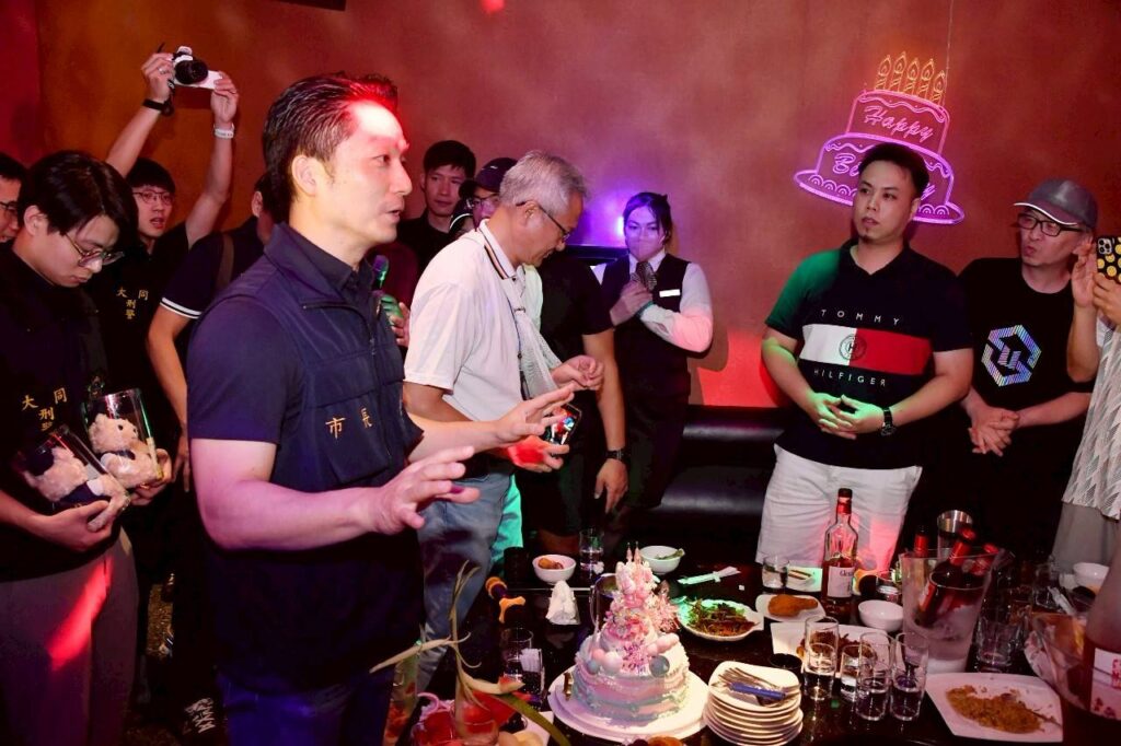 稽查當晚,市府團隊也巡查大同區知名KTV業者,進行場所安全與法規查核。期間蔣萬安親向現場民眾發送宣導品、推廣防詐與用藥安全知識,並巧遇一組正在為壽星慶生的家庭,他也親切送上祝福,祝賀生日快樂,並勉勵年輕族群在市府團隊守護下,度過一個平安、健康、有收穫的暑假。