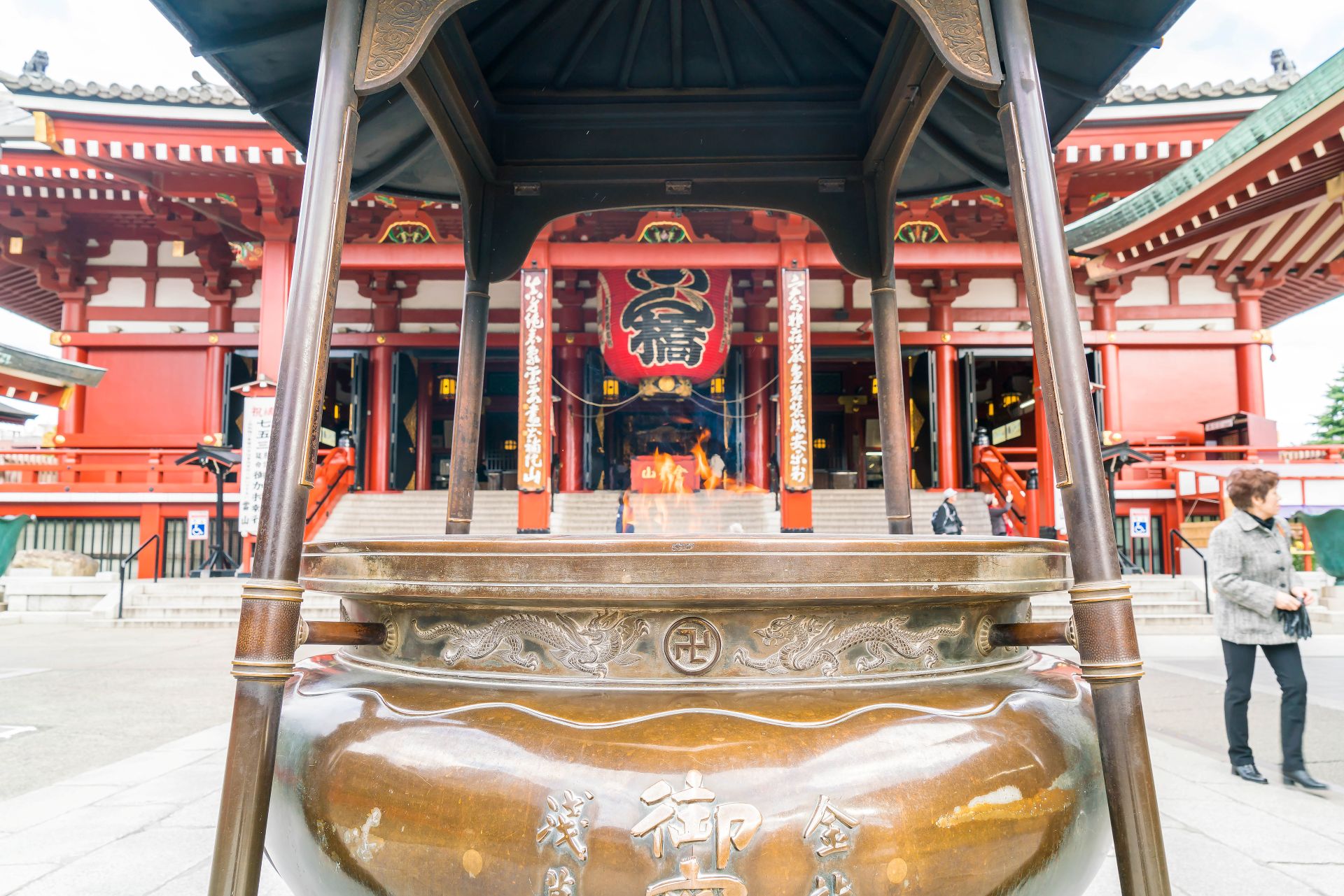 川崎大師因「厄除」靈驗而深受家庭與上班族喜愛,新年期間參道熱鬧非凡,小吃攤聚集,年節氣氛濃厚。